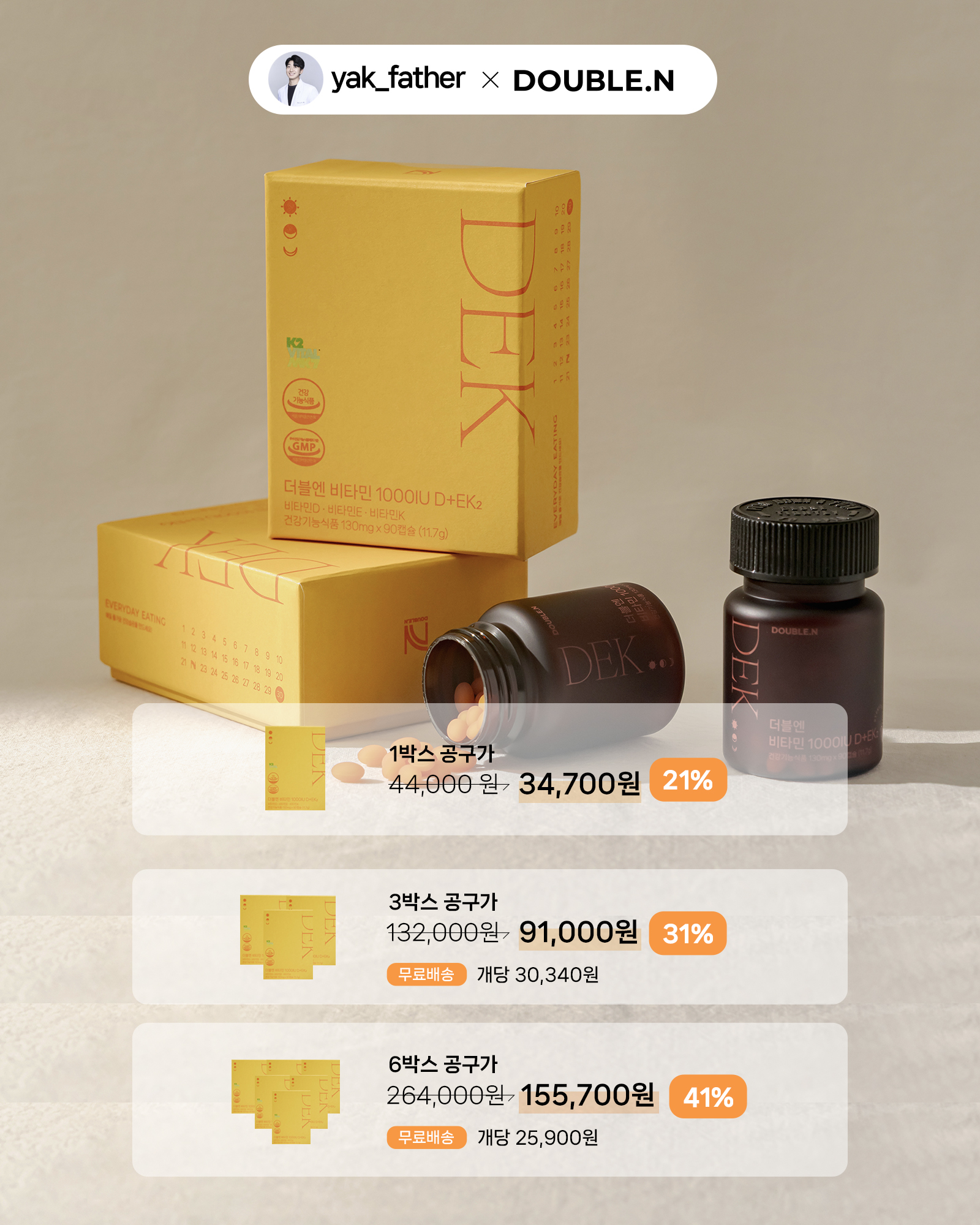 [yak_fatherX더블엔] 비타민 1000IU D+EK2 (1박스/90캡슐)